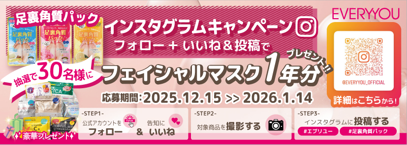 公式インスタグラムをフォロー+いいね!をして、足裏角質パックを使ったところをパッケージとともに投稿いただくと、抽選で30名様に“フェイシャルマスク1年分”をプレゼント!
